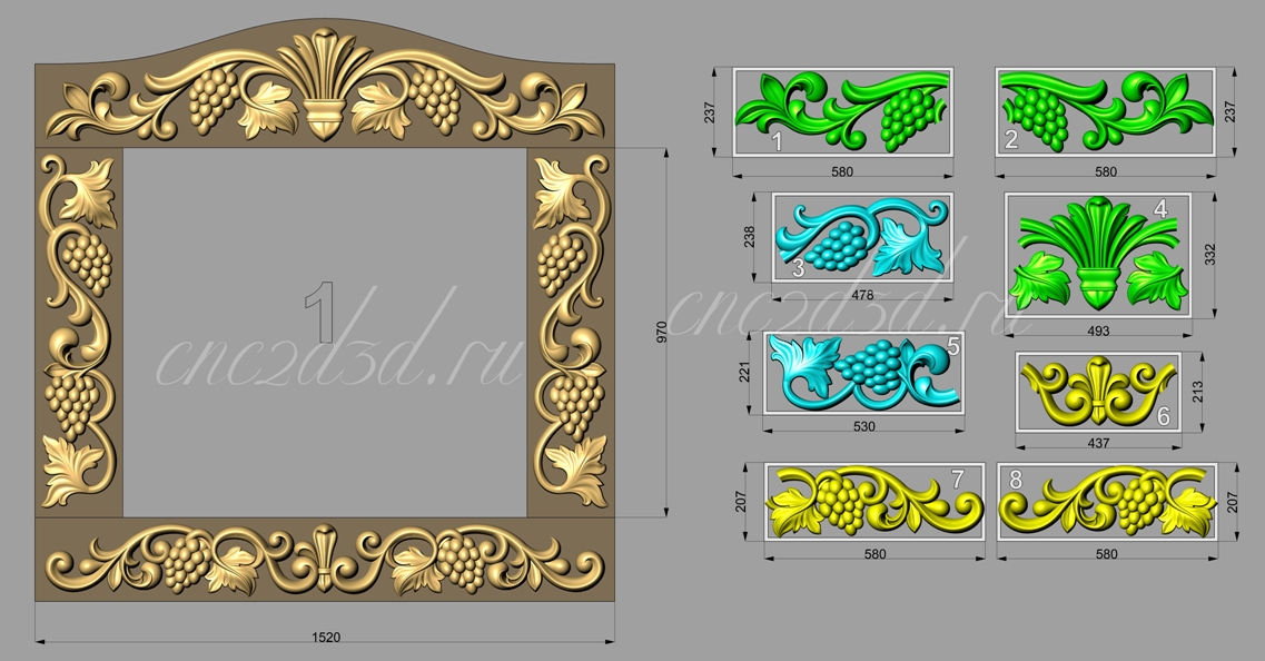 Резной наличник, украшенный ветвями винограда и виноградными гроздьями. Разбивка модели на детали с учетом размеров габаритов рабочего поля станка заказчика, 2025 г.