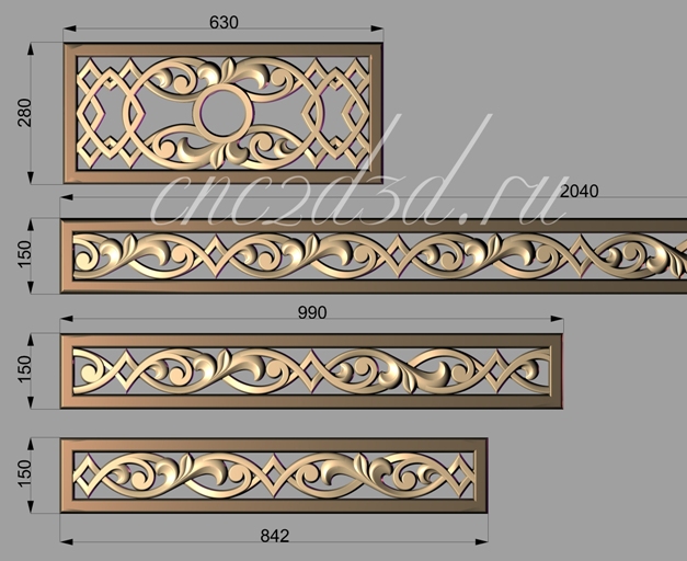 Новая страница посвящена 3d моделям декоративных решеток. Решетки очень часто сейчас стали изготавливать на станках с ЧПУ в виде имитации изделий, отлитых из металла. В качестве заготовки используется при этом - древесина твердых пород или МДФ, после чего заготовка покрывается темными лаками или эмалью, что дает эффект изделия из металла. При таком способе изготовления решеток по 3Д моделям значительно снижается себестоимость получения итогового изделия, т.к. не требуется использования технологий литья и спец оборудования для этого.